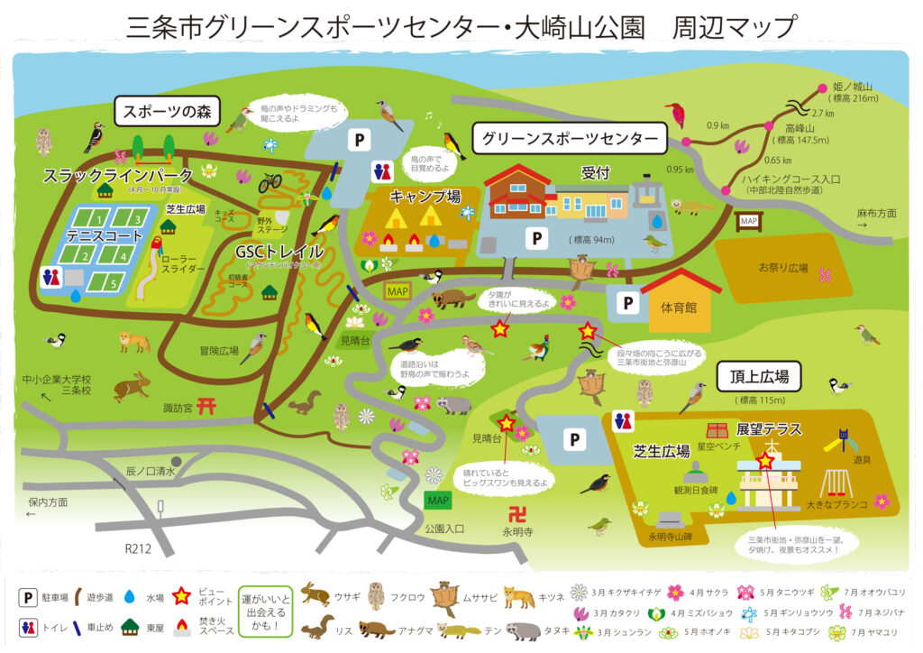 隣接する大崎山公園からは三条市街地や弥彦山を一望でき、どの季節にも美しい眺めを楽しむことができる。